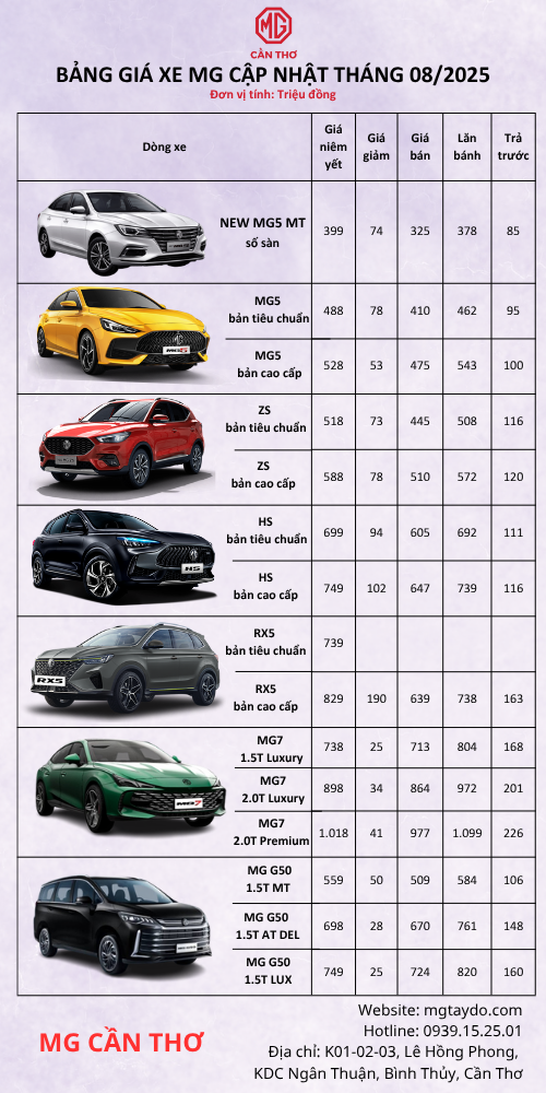 MG Cần Thơ hiện đang có mức giá cực tốt cho các dòng xe MG trong năm 2025 và đặc biệt là tháng 08/2025. Sau đây là giá xe mới nhất tháng 08 cùng với những mức ưu đãi cập nhật mới nhất